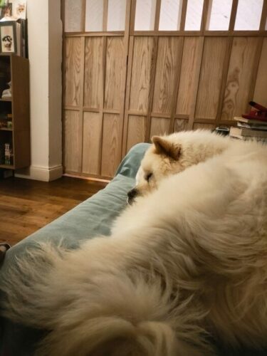 Bouba vient d’avoir 8 ans et c est un vrai chow chow de compagnie, qui adore les gens en général mais qui est spontanément plus à l aise avec les femmes; qui adore aussi les canapés et les balades.