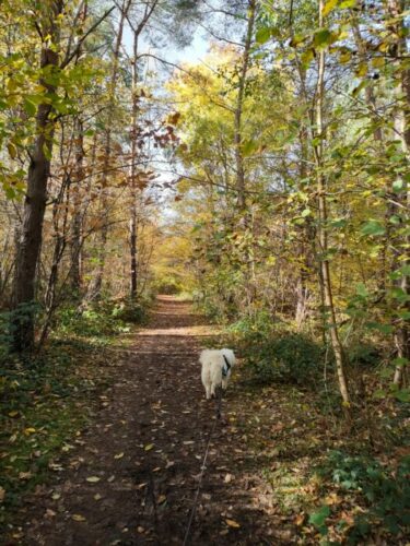 Nous avions pris garde à ne pas la faire adopter dans une famille avec d’autres chiens, et c’était peut être prudence, mais en tous cas en balade elle croise ses congénères sans leur prêter d’attention, et ça c’est plaisant. Passé les 500 m litigieux, se promener avec Qin-A n’est que du bonheur!
