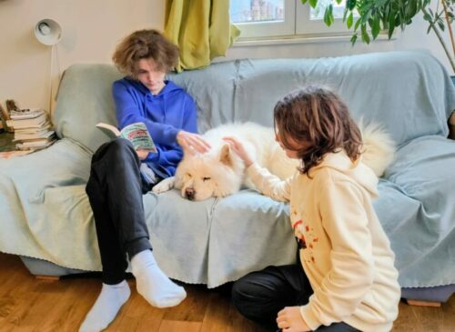 …. mais aussi de jeux et de tendresse avec son jeune deux pattes dès qu’il rentre de l’école…..