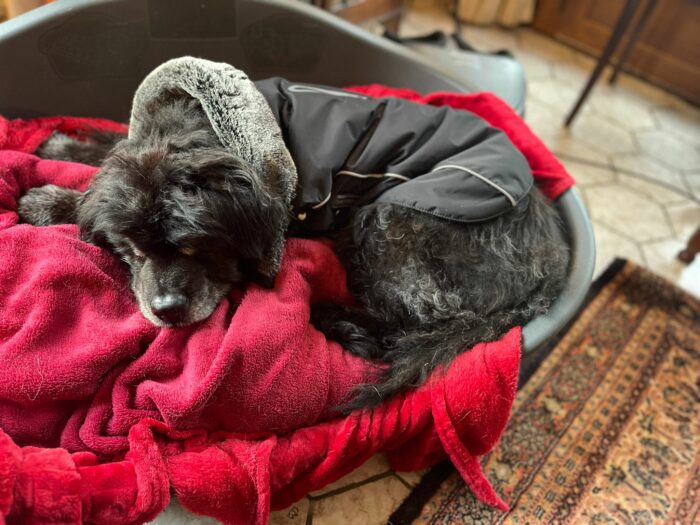 26 novembre: Jouer dans la neige, c’est super, mais notre pauvre Farouk est sujet aux abcès plantaires et il faut beaucoup protéger ses coussinets.
