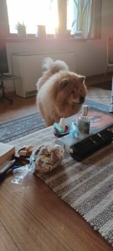 Il leur fait faire du sport en fuyant le brossage mais c’est sans compter sur la ténacité de vieux chowistes! Toujours la brosse et la paire de ciseaux à portée de main et hop! un moment d’ inattention de Yoko et une touffe de poil disparait! Le museau dans la gamelle est aussi un moment propice pour dégager les fesses, hop! hop! A ce rythme, dans quelques semaines Yoko sera nickel!