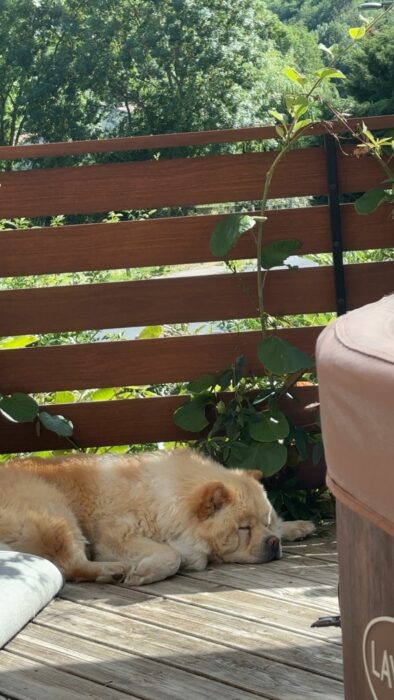 Ça c’était ce matin. Je cherchais Kenaï après m’être réveillée et il faisait en fait la bronzette. »