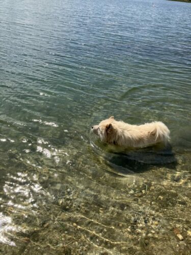Ma fille est venue avec sa chienne samedi et a cette occasion nous avons découvert une surprenante petite Elsa lors de la promenade. Il y avait des nuages et du vent,il faisait bon et apparemment elle a adoré. A tel point que son rythme de marche était plus soutenu et de « fil en aiguille » elle a accompli son premier exploit en faisant le tour du petit lac (soit 3 kms!1h1/2 de marche!), mais en s’arrêtant quand même au gré de ses envies! Je pense que Naika devait la booster.