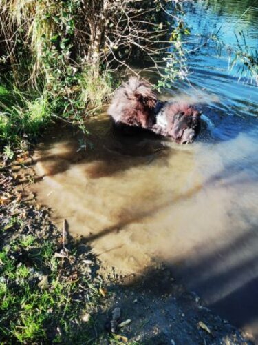 26 juin 2019 : Balou à chaud en cette semaine caniculaire, c’est pourquoi il en profite pour se tremper à la moindre occasion.