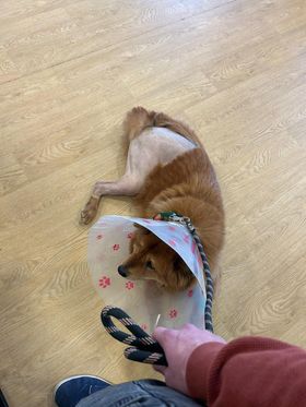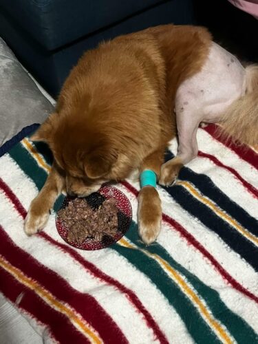 Laureen: « Mia récupérée ! Fatiguée. Mais elle pose la patte au sol. Elle ne ressemble plus à un chow chow mais bon! »