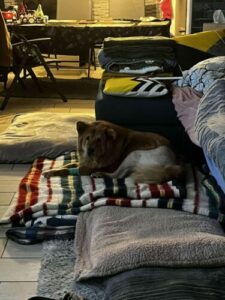 Effectivement Boomer apprécie être dehors mais il rentre volontiers se coucher vers 22h et, si les premiers temps il se réveillait vers 3h du matin, tournait, virait et aboyait au moindre bruit, ses adoptants ont résolu le problème en…. arrêtant le chauffage . En plus c’est bon pour le porte-monnaie et pour la planète!