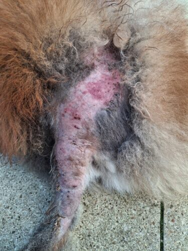 Et Loki ne cherchera pas à se gratter plus que ça, pas plus qu’un chien qui aurait un énorme hot spot sur le dos, les croutes gênent, les poils frottent et chatouillent la peau à nue….