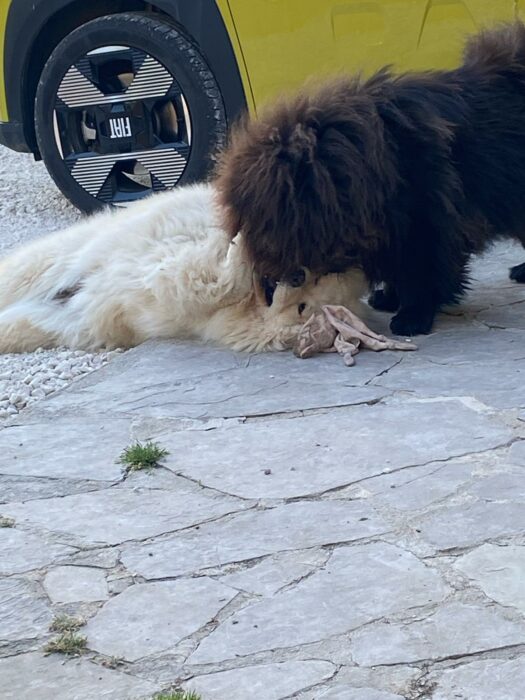 Rapidement Sandrine va enlever la colerette et la remplacer par un collier-lune, parce que ce n’est pas facile pour des chiens de vivre ensemble lorsque l ‘un d’ eux est handicapé dans ses mouvements par cet immense carcan.