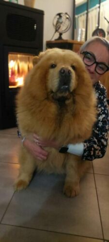 Laure: « Prince nous comble de bonheur. Quand le temps le permet balade de 2 km tous les soirs. Aujourd’hui il pleut; comme tout bon chow il reste devant la porte fenêtre ouverte. Je m’inquiétais pour la gamelle. Je crois qu’il a pris des kilos, il s’est étoffé et c’est pas que du poil!