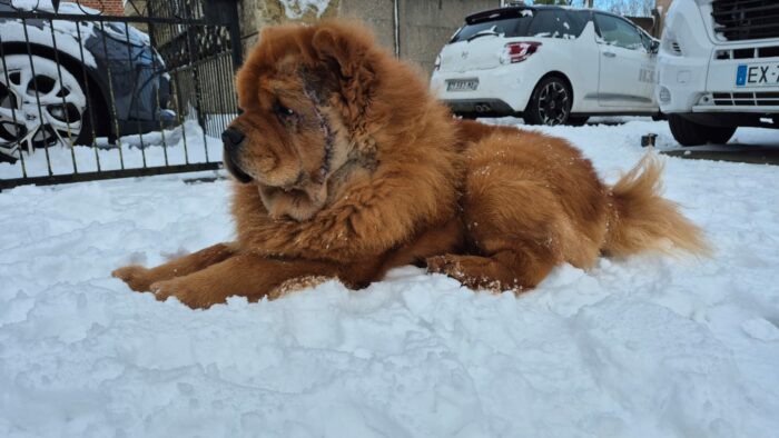 Castration à laquelle nous avons ajouté un lifting des plis de la face. « J’ai enlevé 8 cm de peau de chaque côté, et il a toujours des plis! Je n’ai pas touché à son oreille car le Mometamax a un effet de 28 jours, on verra lors du rappel, par contre j’ai évidemment regardé et ça va mieux par rapport à la première visite où l’oreille était carrément à vif. Qu’est ce qu’il devait souffrir! » nous a dit la vétérinaire. « Il faudra bien prévenir les adoptants qu’une otite chronique est longue à guérir totalement et il peut y avoir des récidives« . Oh! oui! On se souvient de Flipper et de Coco Chanel, pour ne citer qu’eux, car il y en a eu bien d’autres, les otites étant très fréquentes chez les chow chows négligés.