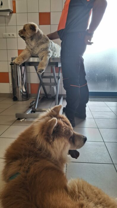 Arrivé au Chowpôle nous avons d’abord constaté l’extrême sociabilité de Nougat, tant avec les chiens qu’avec les humains et nous avons pris quelques vidéos qui le montrent..