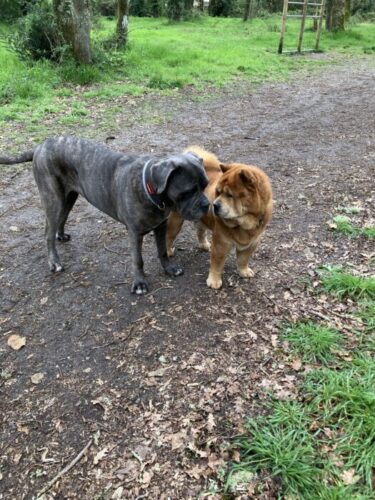 Il y a régulièrement Minia, femelle chow de bientôt 7 ans. Pas super copine au départ avec Naya et maintenant elles se tolèrent bien et font même quelques rares parties de jeux.