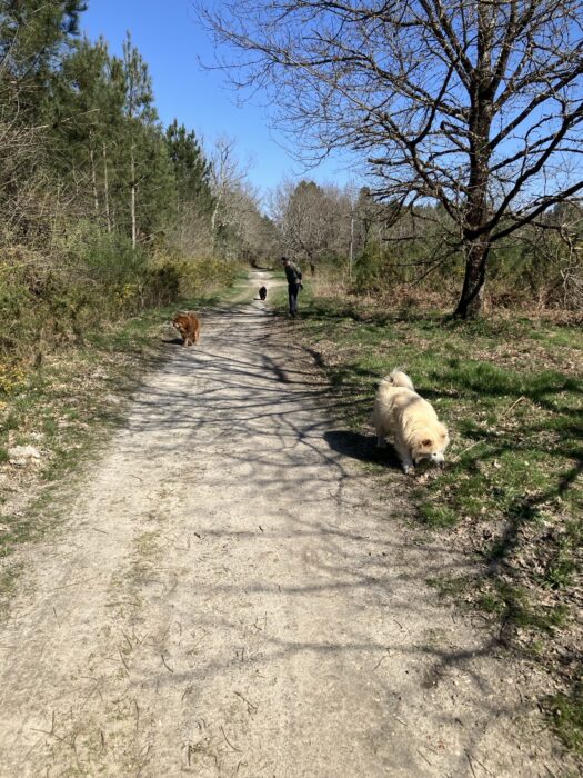 Nous avons un peu investigué pour Phalco, car il ne trottait plus autant lors des balades. Il s’avère – en plus de ses abcès chroniques au niveau des espaces interdigitaux – qu’il avait des champignons au niveau des coussinets (traitement fait), ainsi qu’une sensibilité générale des coussinets des pattes avant. Tous les soirs, Monsieur reçoit son massage avec un baume hydratant apaisant. On le voit marcher prudemment, comme sur des œufs par moments, mais cela ne l’empêche pas de continuer à apprécier ses balades. Il est simplement un peu plus au ralenti qu’avant, ce qui ne déplaît pas à Naya, qui aime traîner, renifler et gratter, et qui depuis quelque temps semble elle aussi apprécier de ralentir le rythme. Les balades se font donc dans une ambiance sereine et apaisée, ce qui est agréable pour tout le monde.