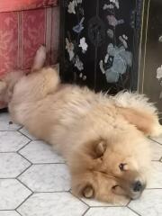 Au moment de se coucher, une bouteille à la main car on vient d’arroser on demande aux chows de rentrer pour la nuit, tout le monde rentre, sauf Kali qui s’est mise en mode panique, elle court de tous côtés pour fuir le danger qu’elle imagine, est à deux doigts de franchir le garde corps ; il est clair qu’un ordre donné avec un objet en main est pour Kali synonyme des coups qu’elle va recevoir, il est clair que Kali a été battue. Et le plus probable est qu’elle l’a été par une femme.