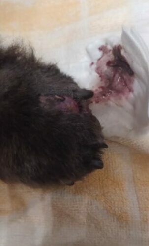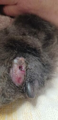 Elizabeth: « Nous avons emmené Sue-Mihn à 10h30 chez le véto, elle a un énorme abcès au niveau du torse, juste derrière la patte avant droite, de la taille d’une demie orange.