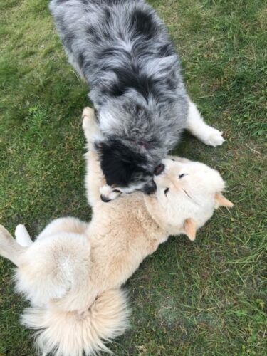 Un peu moins de balades pour réduire les sorties, mais heureusement le jardin leur permet de se défouler sans soucis et tous les jours c’est grosse partie de jeu entre Naya et Phalco !