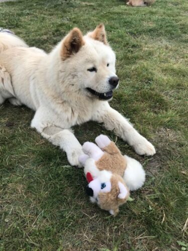 Il y a régulièrement Minia, femelle chow de bientôt 7 ans. Pas super copine au départ avec Naya et maintenant elles se tolèrent bien et font même quelques rares parties de jeux.