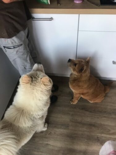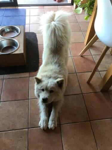 8 février 2020: « Naya et Phalco vont très bien et profitent de leur belle vie de chow , je pense que la routine de gamelle, balade, jeux et os mâcher leur va à ravir ! »
