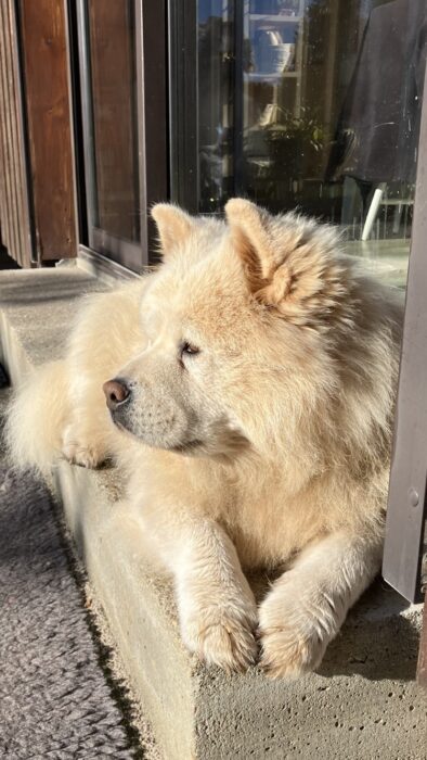 Elle s’est fait toiletter vendredi. Je fais venir une toiletteuse à la maison maintenant, et Naya est beaucoup plus apaisée: elle se laisse faire, elle est patiente… et évidemment, avec deux-trois friandises, tout devient encore plus facile pour elle. Elle a retrouvé tout son “blond”, elle est magnifique.