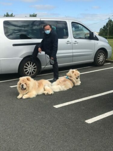 la voiture (8 places – une banquette pour chaque chow) 2 heures avant le départ !!