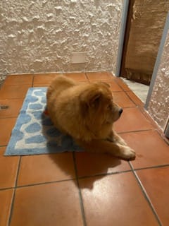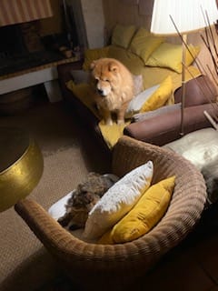 Avec Laurence et Yannick, amoureux des chows de longue date, nulle crainte pour Okeanos. Ils connaissent tout des soins nécessaires et des fragilités. Balades au programme pour le plaisir et pour la musculature (« Okeanos est parfait avec les chiens qu ‘ on croise »), huile de coco, (« Il aime aussi le fromage et lécher les pots de yaourt« ) et longues siestes dans la fraicheur de l’ habitation (« il nous attend en bas la nuit, il n’aboie pas, il semble parfaitement à l’aise« )