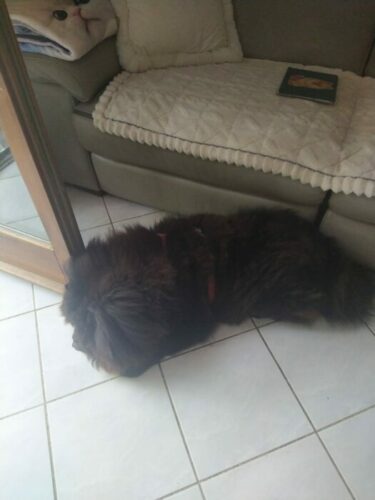 Maud: « Pakito s’habitue très bien à l’intérieur. A l’extérieur il est toujours un peu craintif et expédie rapidement ses promenades.