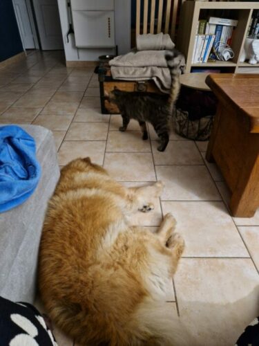 En tous cas Madrina est hyper choyée par ses 2 pattes qui ne l’ ont pas quittée durant ces premières journées de post-op: « La journée d hier s est bien passée dans l ensemble je l ai sortie souvent (sur demande dans le jardin). Elle est vive je pense qu elle se rétablit bien ( il faut dire qu elle est jeune) mais nous nous sommes HS à la surveiller H24. Cette nuit c est Christophe qui a veillé , la nuit s est bien passée »